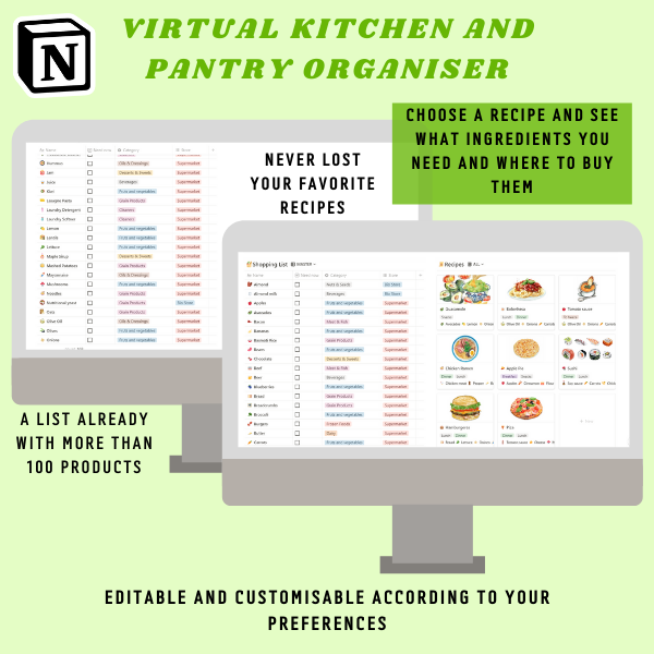 This template will allow you to not waste time regarding groceries! You will have a virtual grocery shop list organised by type of item and store, that is connected to your favourite recipes! Get to know which ingredients you have to buy to make your favourite recipes! Check out the ingredients on your phone once they are already in your basket in the supermarket! The most effective way to organise your grocery needs!